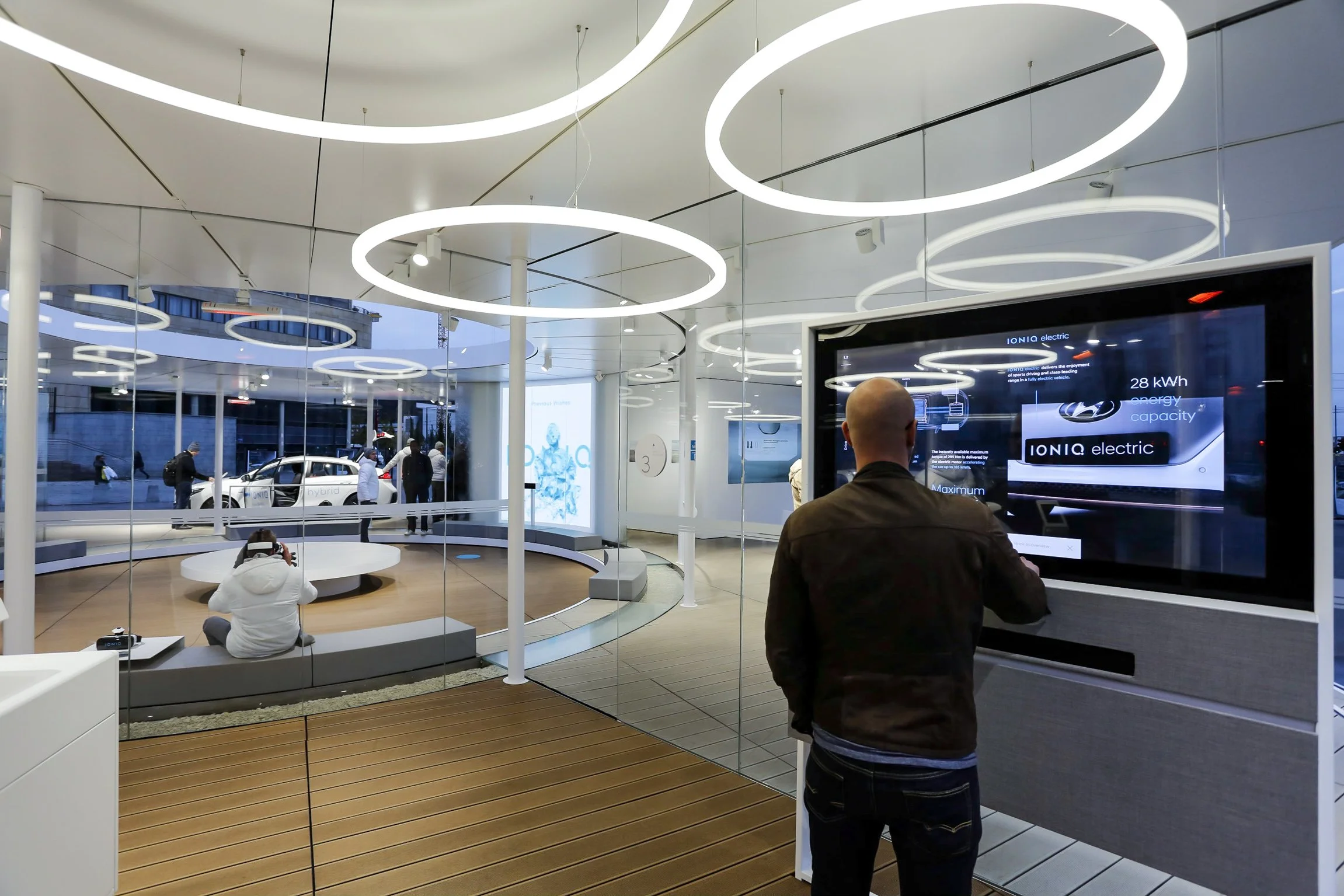 Tablet ‘Forest’ of testimonials to create interest with customers. 25 meter long digital screen for news and product communications. Quick-service pods.